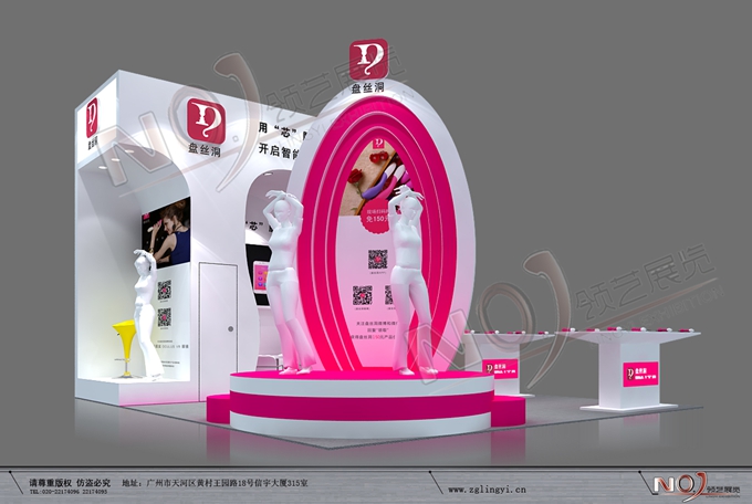 契合的盤(pán)絲洞品牌形象和產(chǎn)品特性,采用弧形、矩形結(jié)構(gòu),再搭配燈具燈光的效果,襯托出展位浪漫、溫馨的氛圍,突出一種青春、激情的時(shí)尚品味。