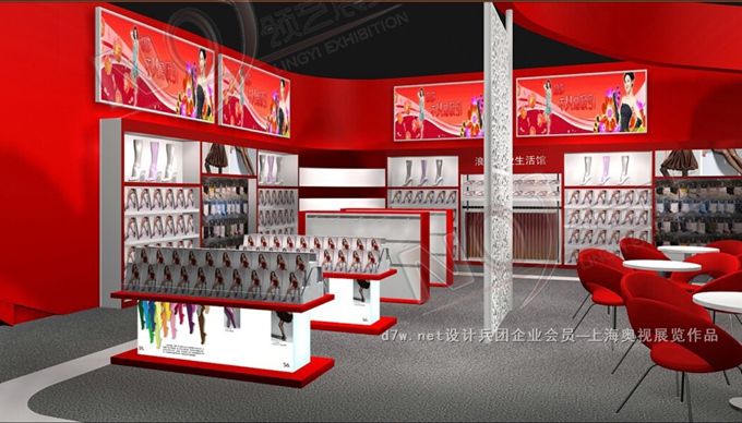 契合的浪莎襪業(yè)品牌形象和產(chǎn)品特性,采用矩形結(jié)構(gòu),再搭配燈具燈光的效果,襯托出展位浪漫溫馨的氛圍,突出一種青春、活力的時尚品味。