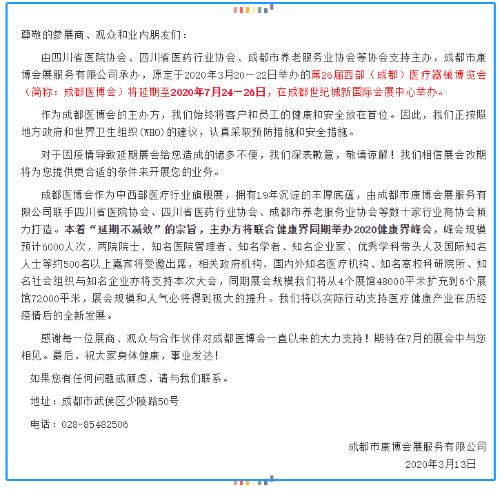 根據(jù)醫(yī)博會設計搭建公司領(lǐng)藝展覽了解到,原定于2020年3月20—22日舉辦的第26屆西部(成都)醫(yī)療器械博覽會(簡稱:成都醫(yī)博會)將延期至2020年7月24—26日,在成都世紀城新國際會展中心舉辦。如需醫(yī)博會展會設計請聯(lián)系領(lǐng)藝展覽,希望我們能在醫(yī)博會搭建上為您添磚加瓦,祝各位朋友收獲多多,滿載而歸!