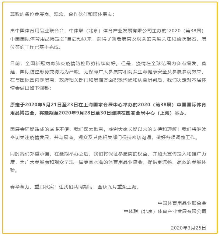 2020年中國(guó)國(guó)際自行車(chē)展覽會(huì)推遲舉辦的通知