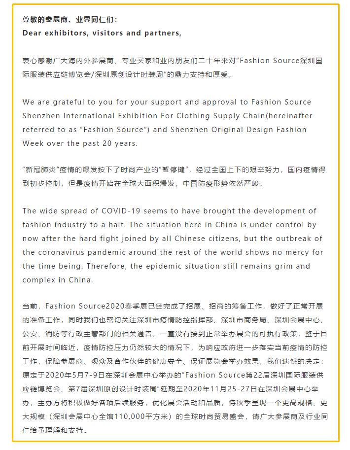 根據(jù)服裝展設(shè)計搭建公司領(lǐng)藝展覽了解到,原定于2020年5月7-9日在深圳會展中心舉辦的“Fashion Source第22屆深圳國際服裝供應(yīng)鏈博覽會、第7屆深圳原創(chuàng)設(shè)計時裝周“延期至2020年11月25-27日在深圳會展中心舉辦,主辦方將積極做好各項后續(xù)服務(wù),優(yōu)化展會活動和品質(zhì),待秋季呈現(xiàn)一個更高規(guī)格、更大規(guī)模(深圳會展中心全館110,000平方米)的全球時尚貿(mào)易盛會,請廣大參展商及行業(yè)同仁給予理解和支持。如需服裝展設(shè)計請聯(lián)系領(lǐng)藝展覽,希望我們能在服裝展搭建上為您添磚加瓦,祝各位朋友收獲多多,滿載而歸!
