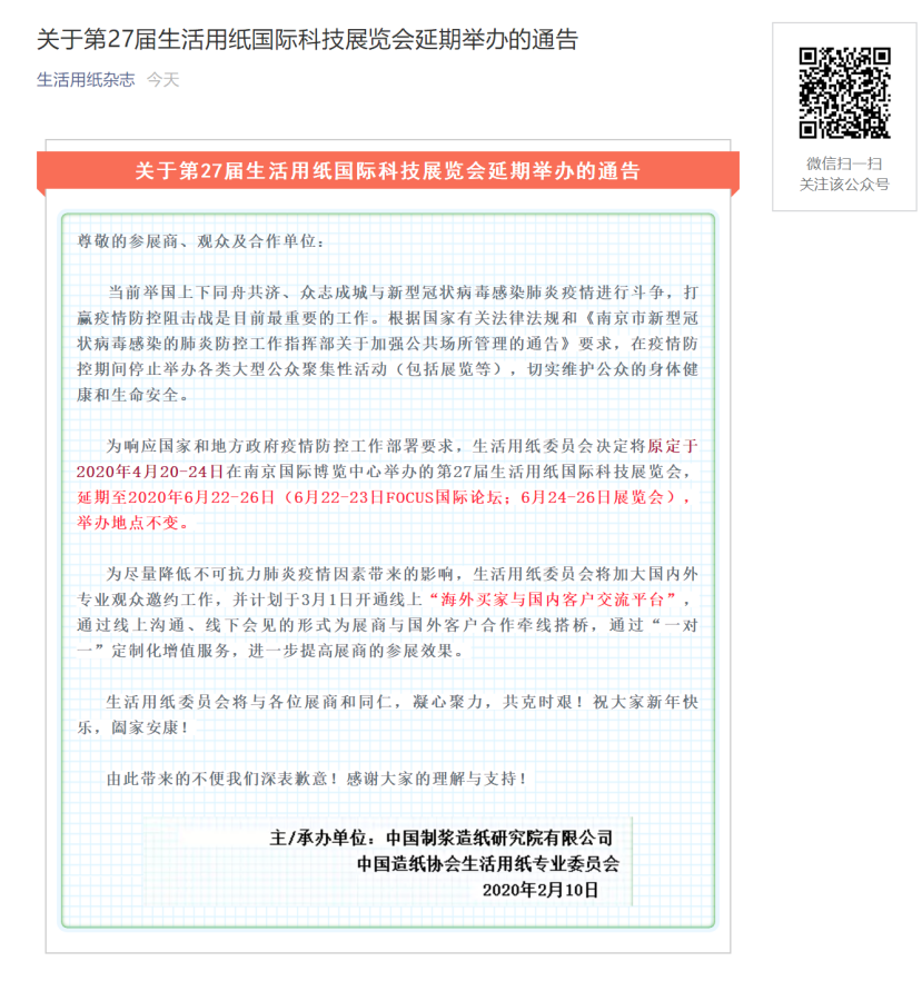 根據(jù)南京紙展設(shè)計(jì)搭建公司領(lǐng)藝展覽解到,為響應(yīng)國家和地方政府疫情防控工作部署要求,生活用紙委員會(huì)決定將原定于2020年4月20-24日在南京國際博覽中心舉辦的第27屆生活用紙國際科技展覽會(huì),延期至2020年6月22-26日(6月22-23日FOCUS國際論壇;6月24-26日展覽會(huì)),舉辦地點(diǎn)不變。如需南京紙展設(shè)計(jì)請聯(lián)系領(lǐng)藝展覽,希望我們能在南京紙展搭建上為您添磚加瓦,祝各位朋友收獲多多,滿載而歸!