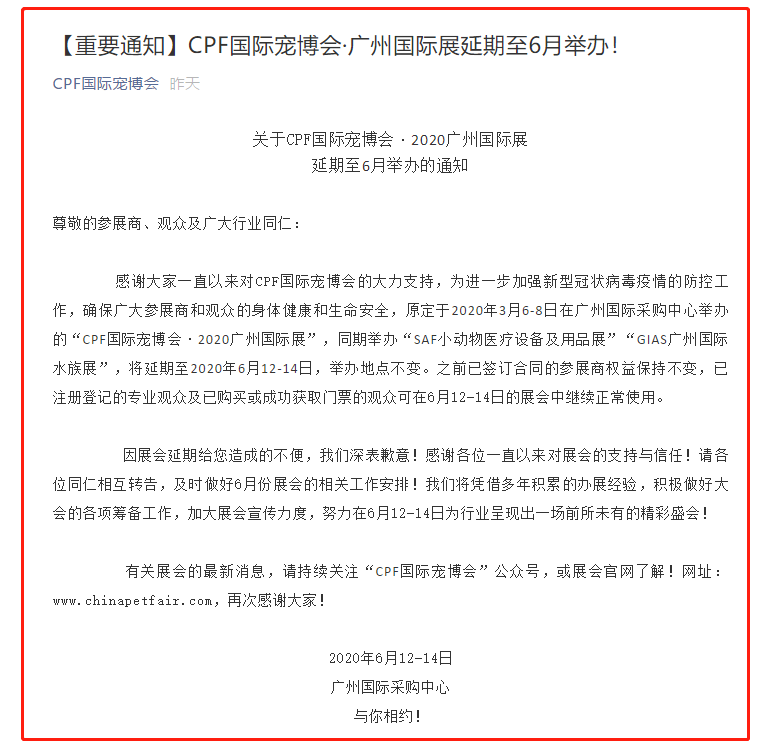 根據(jù)CPF寵博會設(shè)計搭建公司領(lǐng)藝展覽了解到,為進(jìn)一步加強(qiáng)新型冠狀病毒疫情的防控工作,確保廣大參展商和觀眾的身體健康和生命安全,原定于2020年3月6-8日在廣州國際采購中心舉辦的“CPF國際寵博會·2020廣州國際展”,同期舉辦“SAF小動物醫(yī)療設(shè)備及用品展”“GIAS廣州國際水族展”,將延期至2020年6月12-14日,舉辦地點(diǎn)不變。如需廣州寵博會設(shè)計請聯(lián)系領(lǐng)藝展覽,希望我們能在寵物展搭建上為您添磚加瓦,祝各位朋友收獲多多,滿載而歸!