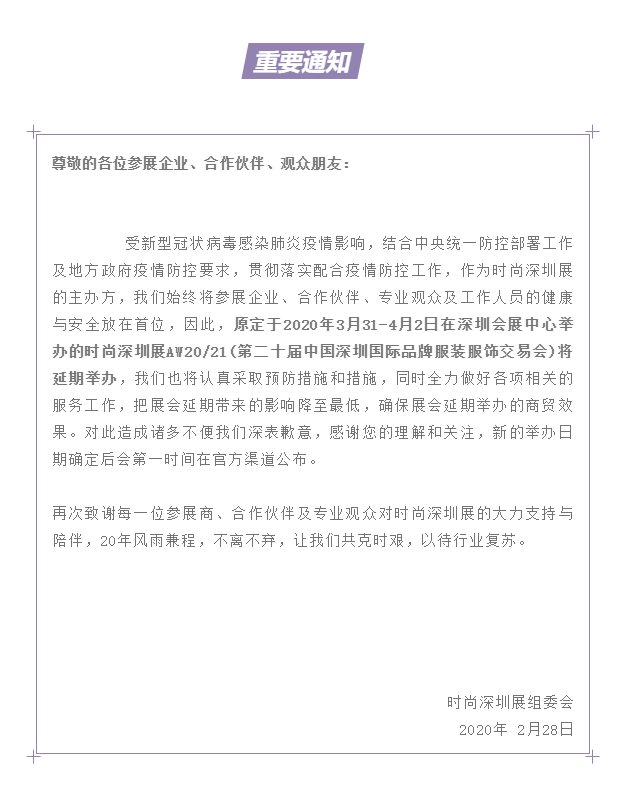 根據(jù)時尚深圳展設(shè)計搭建公司領(lǐng)藝展覽了解到,受新型冠狀病毒感染肺炎疫情影響,結(jié)合中央統(tǒng)一防控部署工作及地方政府疫情防控要求,貫徹落實配合疫情防控工作,作為時尚深圳展的主辦方,我們始終將參展企業(yè)、合作伙伴、專業(yè)觀眾及工作人員的健康與安全放在首位,因此,原定于2020年3月31-4月2日在深圳會展中心舉辦的時尚深圳展AW20/21(第二十屆中國深圳國際品牌服裝服飾交易會)將延期舉辦,我們也將認真采取預防措施和措施,同時全力做好各項相關(guān)的服務(wù)工作,把展會延期帶來的影響降至最低,確保展會延期舉辦的商貿(mào)效果。對此造成諸多不便我們深表歉意,感謝您的理解和關(guān)注,新的舉辦日期確定后會第一時間在官方渠道公布。如需時尚深圳展設(shè)計請聯(lián)系領(lǐng)藝展覽,希望我們能在時尚深圳展搭建上為您添磚加瓦,祝各位朋友收獲多多,滿載而歸!