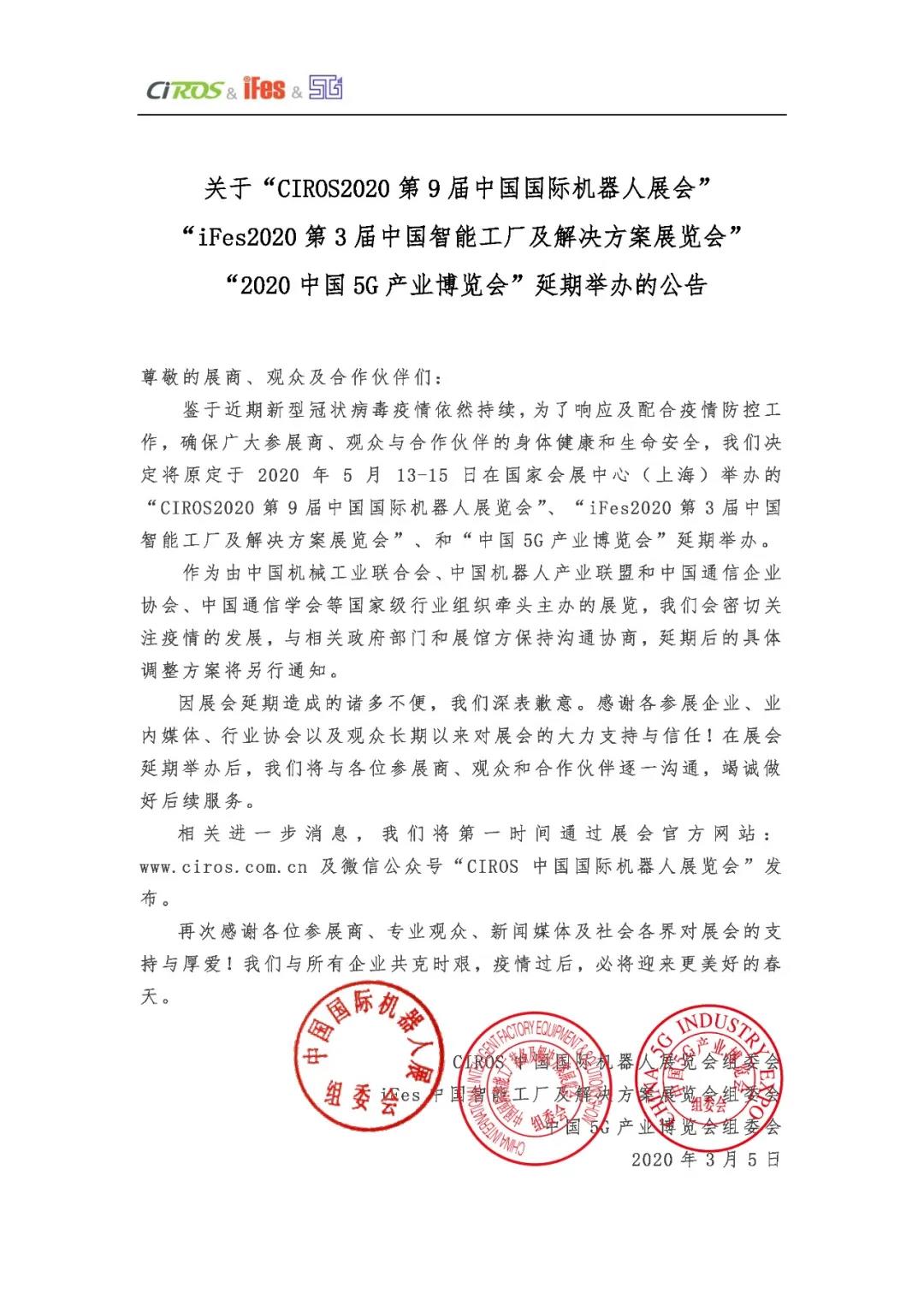 根據(jù)上海展臺(tái)設(shè)計(jì)搭建公司領(lǐng)藝展覽了解到原定于2020年5月13-15日在國(guó)家會(huì)展中心(上海)舉辦的“CIROS2020第9屆中國(guó)國(guó)際機(jī)器人展覽會(huì)”、“iFes2020第3屆中國(guó)智能工廠及解決方案展覽會(huì)”和“中國(guó)5G產(chǎn)業(yè)博覽會(huì)”延期舉辦。如需上海展臺(tái)設(shè)計(jì)請(qǐng)聯(lián)系領(lǐng)藝展覽,希望我們能在上海展臺(tái)搭建上為您添磚加瓦,祝各位朋友收獲多多,滿載而歸!
