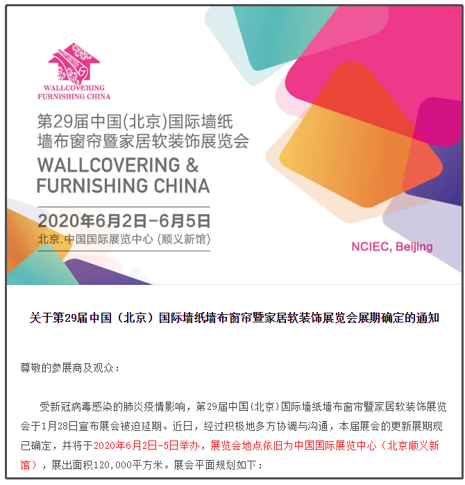 根據(jù)北京展會(huì)設(shè)計(jì)搭建公司領(lǐng)藝展覽了解到,受新冠病毒感染的肺炎疫情影響,第29屆中國(guó)(北京)國(guó)際墻紙墻布窗簾暨家居軟裝飾展覽會(huì)于1月28日宣布展會(huì)被迫延期。近日,經(jīng)過積極地多方協(xié)調(diào)與溝通,本屆展會(huì)的更新展期現(xiàn)已確定,并將于2020年6月2日-5日舉辦,展覽會(huì)地點(diǎn)依舊為中國(guó)國(guó)際展覽中心(北京順義新館),展出面積120,000平方米。如需北京展會(huì)設(shè)計(jì)請(qǐng)聯(lián)系領(lǐng)藝展覽,希望我們能在北京展會(huì)搭建上為您添磚加瓦,祝各位朋友收獲多多,滿載而歸!