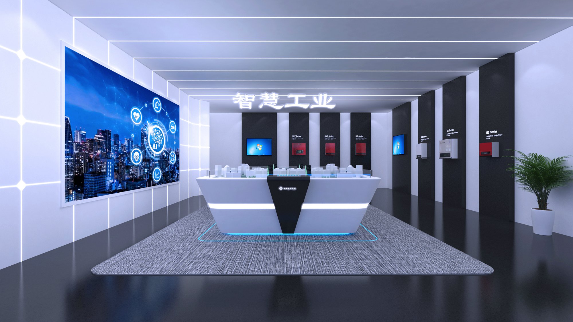 契合固德威的品牌形象和產品特性,采用開放式結構進行合理的分區(qū),再搭配燈具燈光的效果,襯托出展廳大氣、豪華的氛圍,突出一種簡約、時尚的品味。